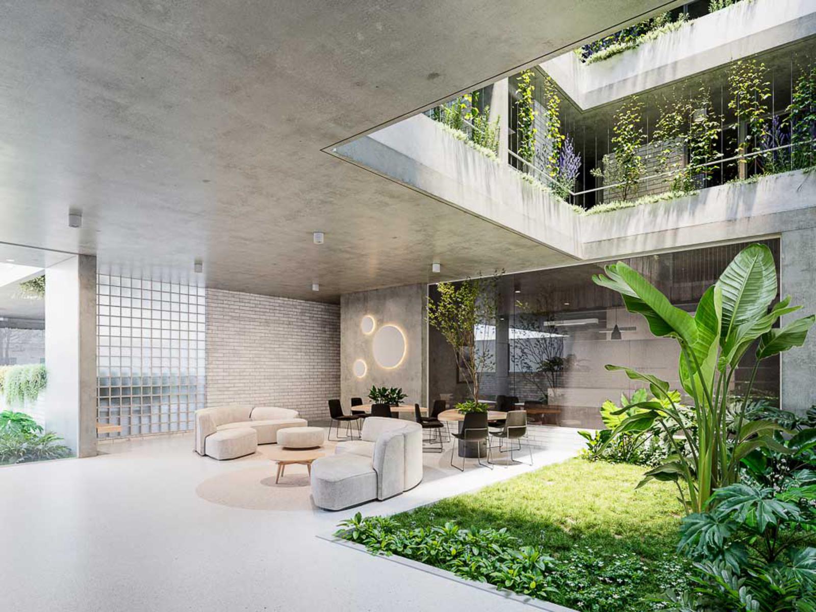 El edificio se organiza en torno a un patio interior, que se convierte en el corazón del proyecto. El mismo se conforma como un espacio verde, de esparcimiento y recreación que busca complementar los espacios abiertos y semicubiertos de las unidades, y generar un ambiente de comunidad en un entorno seguro. A este patio se le suman variados amenities como un espacio de coworking, quincho, gimnasio, pileta y solárium.