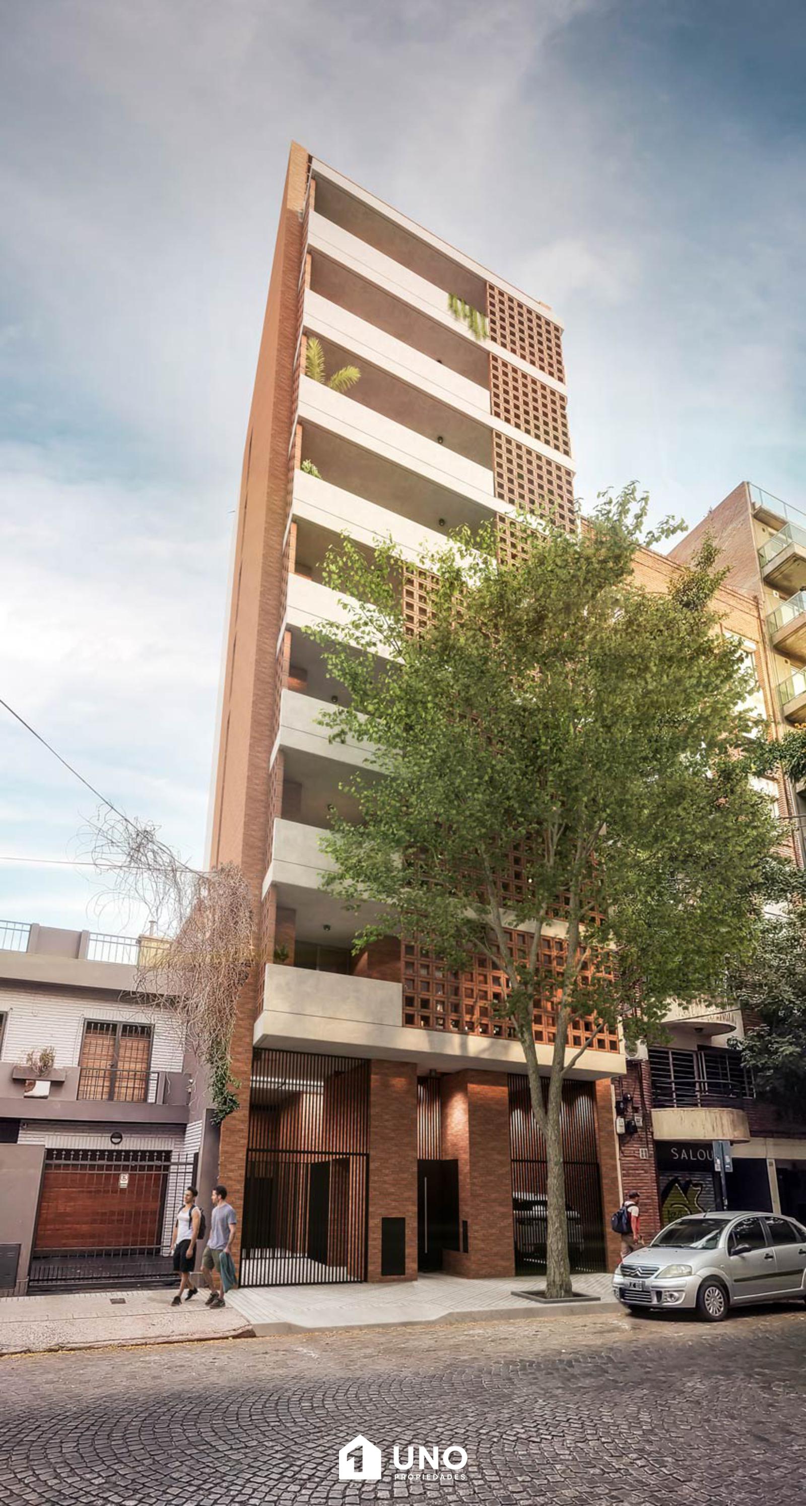 Parrilla en balcones con frente en departamentos de 2 y 3 dormitorios. Balcones con parasoles con ladrillo visto.