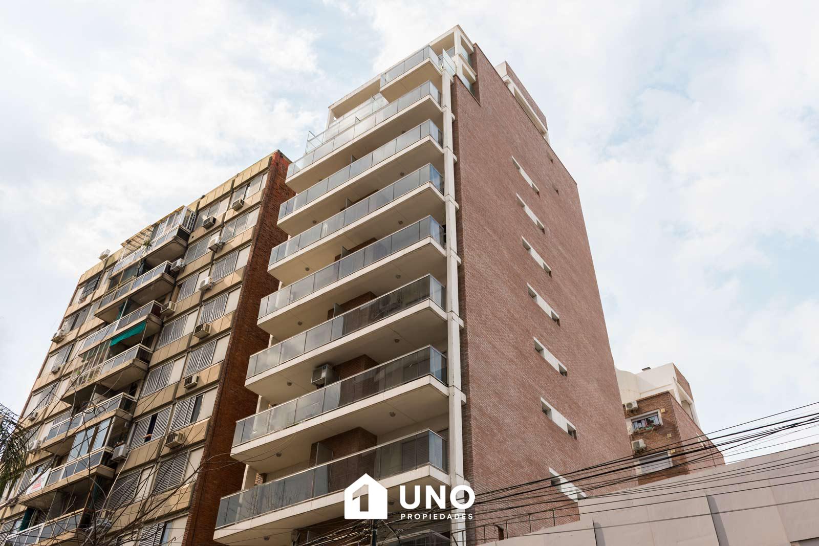 Edificio de dos torres divididas en el centro por un patio parquizado, un ascensor por torre y cocheras cubiertas.