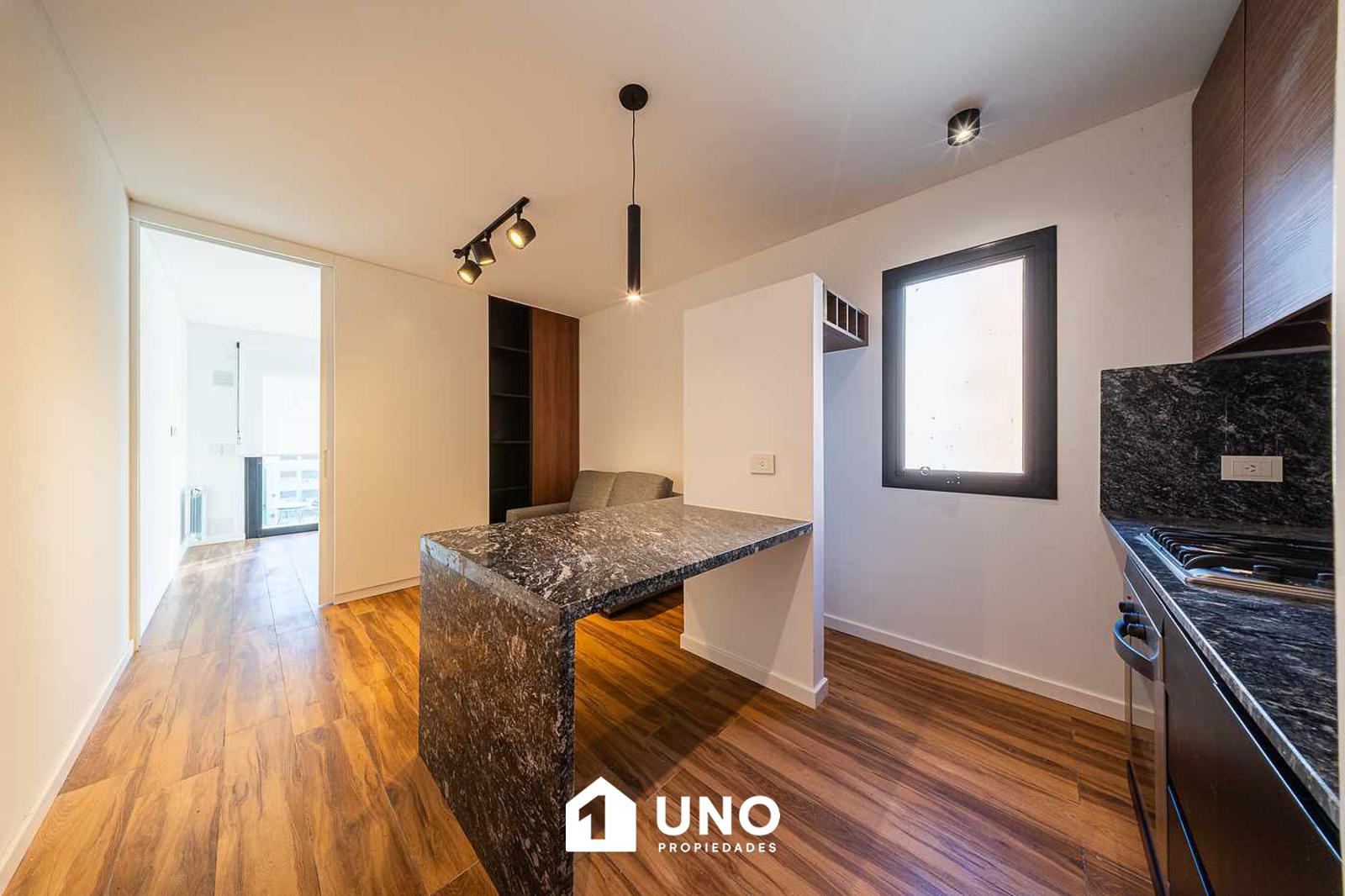 Ambiente único con puerta de seguridad y cerradura inteligente, cocina totalmente equipada (horno empotrado, anafe y purificador) + barra desayunadora, baño con sanitarios y griferia de primera línea y patio al contrafrente.