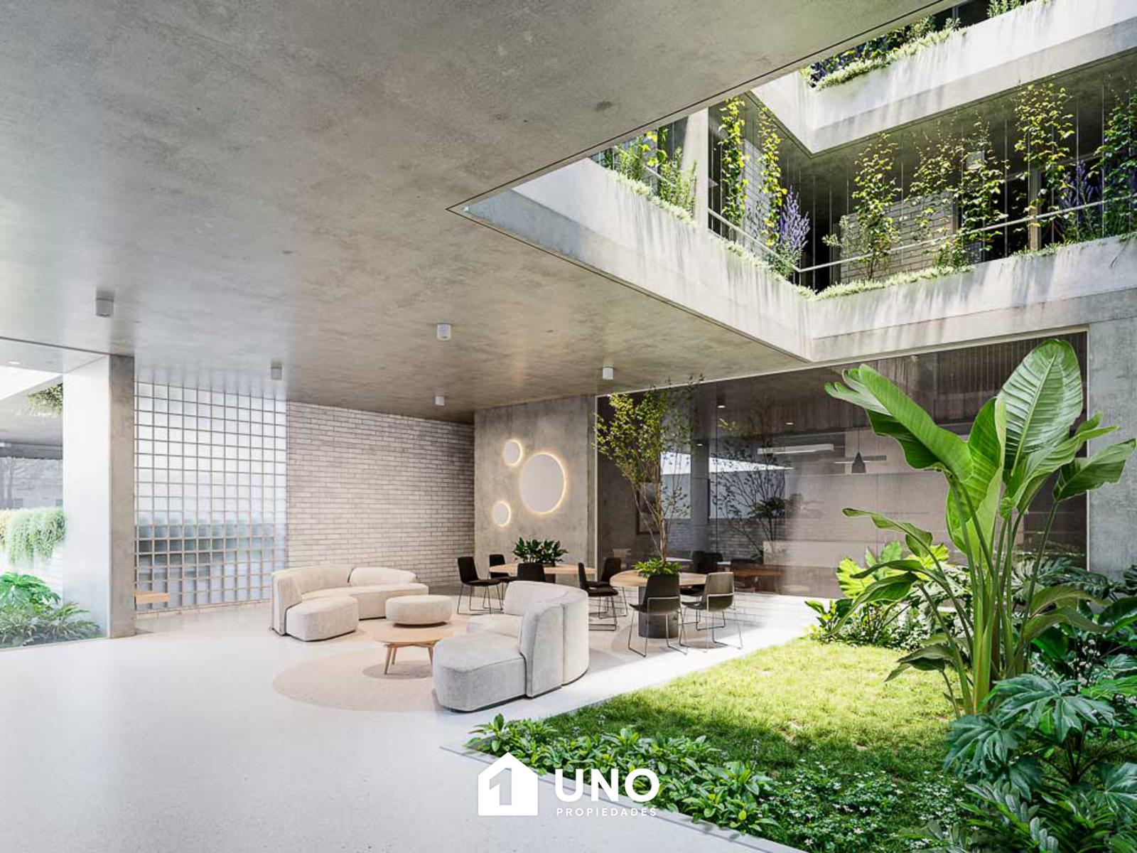 Áreas verdes y espacio de coworking en planta baja.