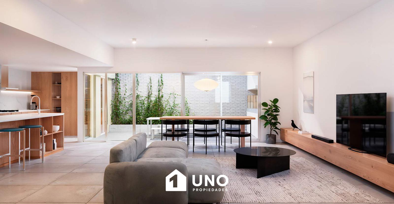 El ingreso es a través de un pasillo amplio que conduce a un patio principal. En planta baja se desarrolla un estar comedor con salida a un segundo patio trasero, cocina integrada con mesada tipo isla, lavadero independiente, un baño completo y un dormitorio con salida al patio principal.