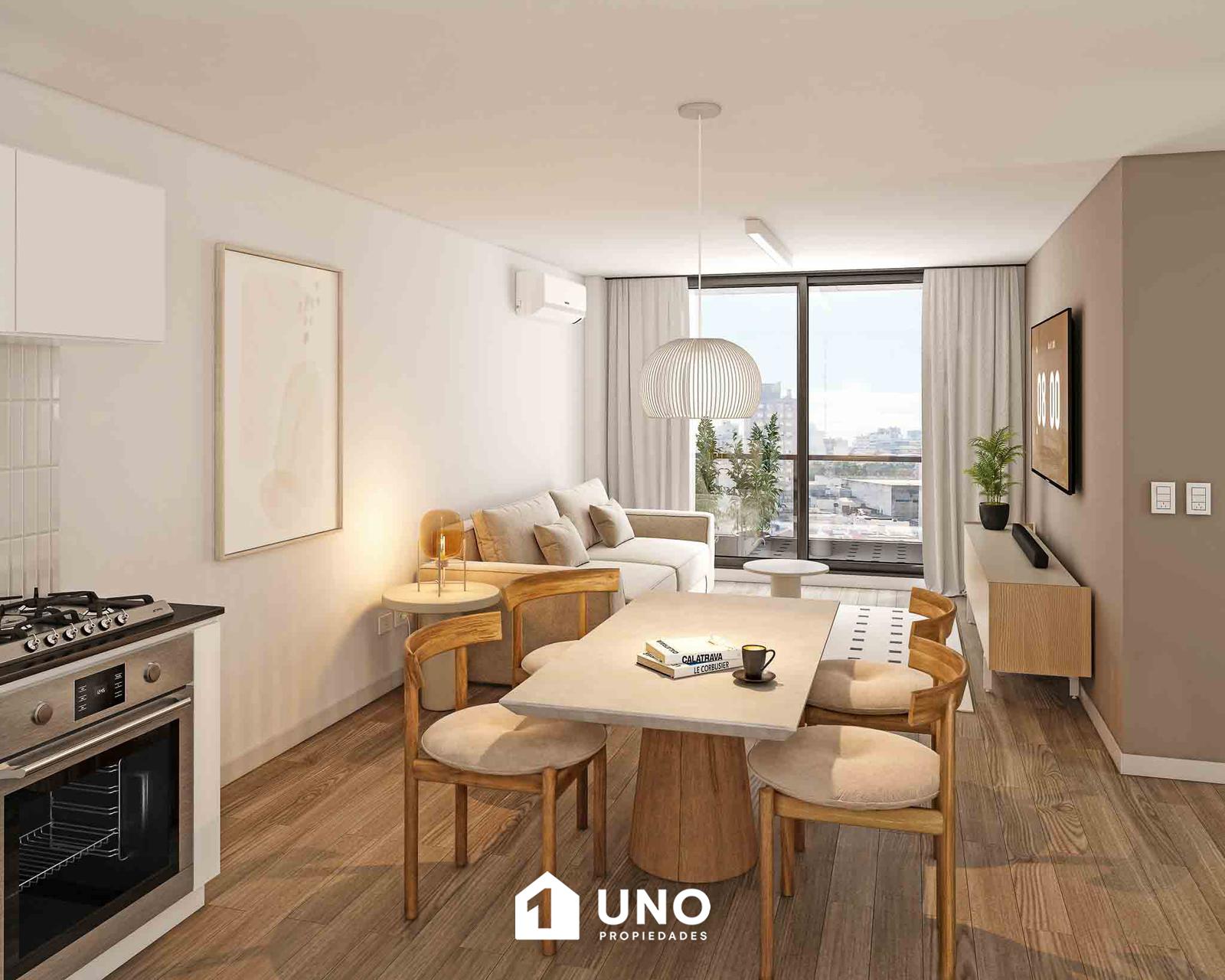 Departamento con entrega en Noviembre de 2027. Ingreso por puerta blindada al estar/comedor que dispone de piso porcelanato y aberturas con DVH, balcón interno, la cocina está equipada con anafe de 4 hornallas + horno empotrado, un dormitorio con placard con interiores terminados, hoja espejada, piso flotante de alto tránsito y baño con ventilación natural.