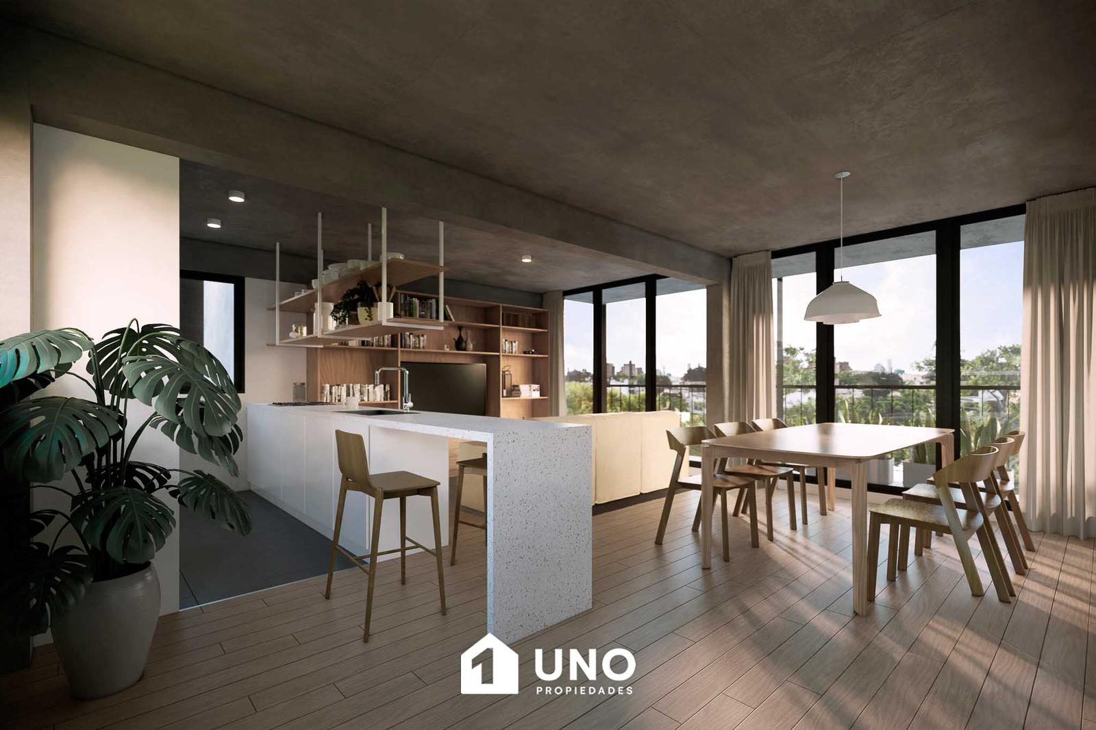 La vivienda se organiza a partir de un estar/comedor central con salida a un patio principal de uso exclusivo de 27m2, que funciona como expansión de uso diario. La cocina se integra al área social y tiene acceso a un segundo patio, más pequeño, que también se comunica con los dormitorios, aportando ventilación e iluminación natural.