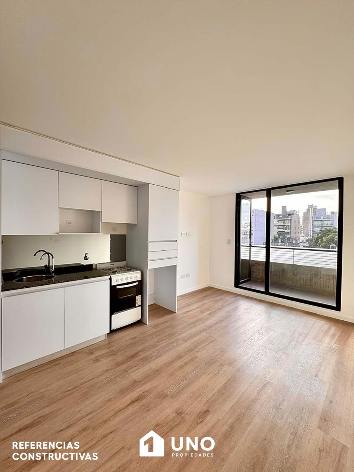 Amplio ambiente único con la cocina totalmente equipada, balcón al contrafrente y baño completo. Quincho con parrillero en azotea.